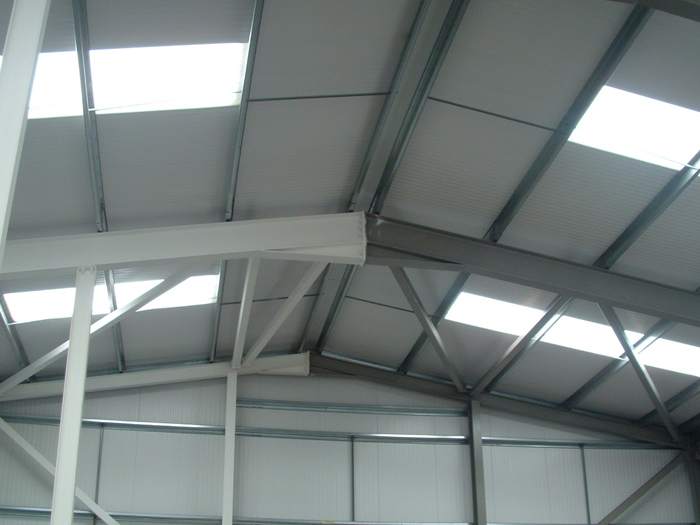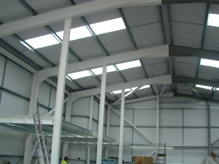 Steel structure inside a warehouse sprayed for fire regulations to achieve a 1 hour rating.